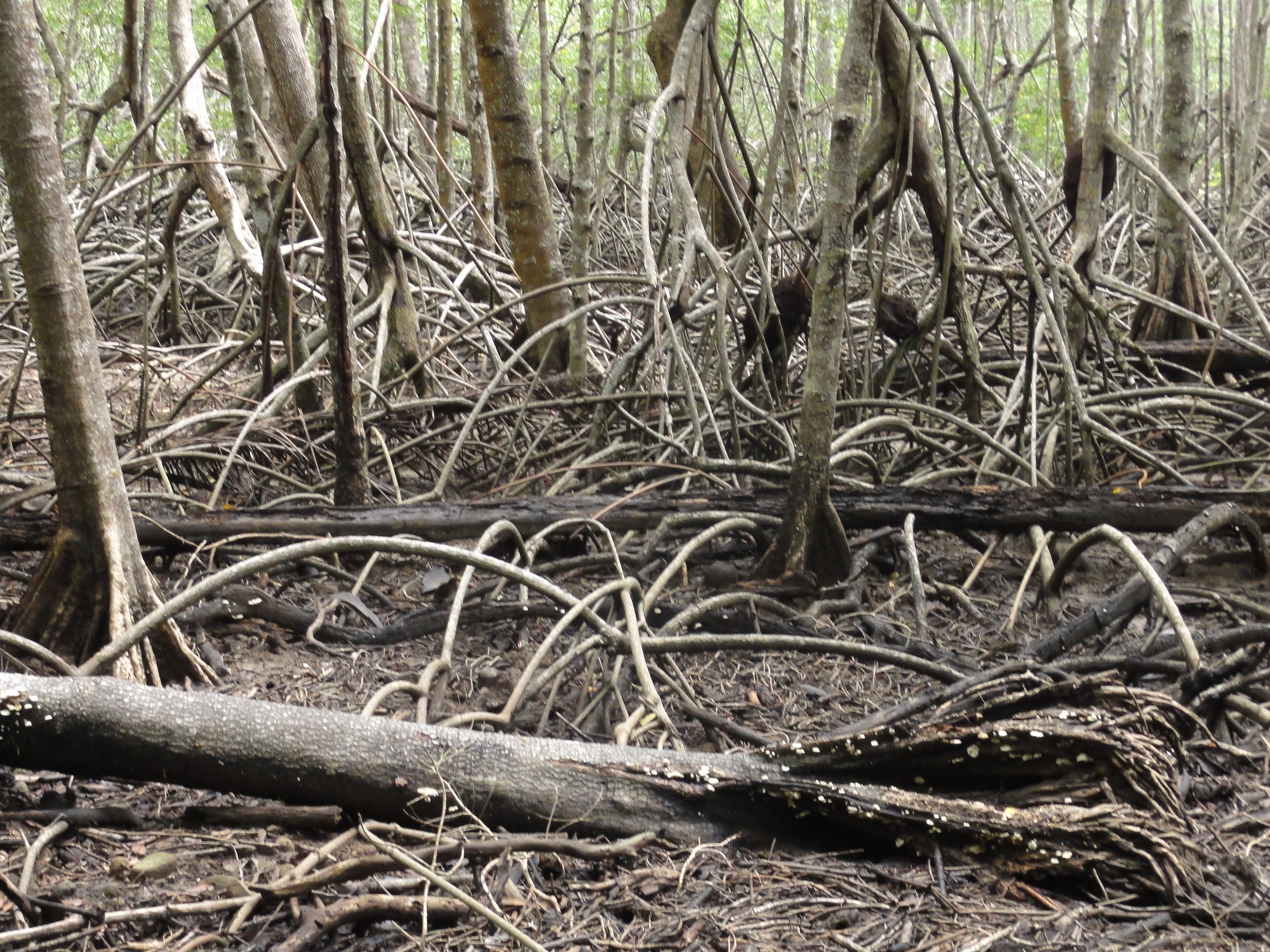 Sometimes Lupé's troop would go to the mangroves. Some of the mangrove trees had long prop roots that held the trees high above the water. Lupé would leap from root to root, playing with the other kids. They played in the mud and splashed in the water. When the water was gone, because the ocean tide went out, the monkeys would find little clams in the sand. They would carry them up onto the tree root where they would sit and pound and roll the clams on the tree branches. It took some time and quite a bit of skill. But, if Lupé was patient, the clam would eventually open, and she could eat the meat.